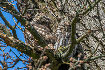 Little owls are the UK/s smallest owl species and is also the most common owl species in the UK to be seen during daylight hours. They are active mainly at dawn, dusk and at night but can also be seen during the day, often sat basking in the sun warming up.